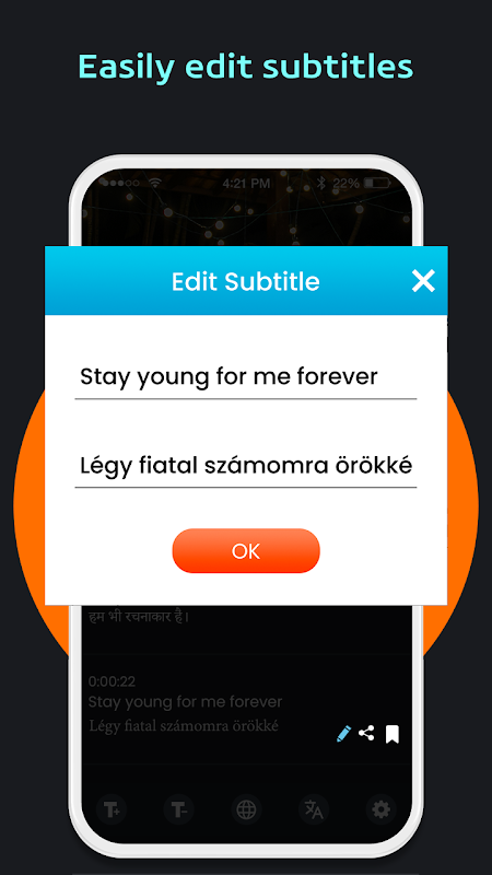 Terwijl u de nieuwe talen leert, kunt u de tekst groter of kleiner maken, en ook alleen de vertaalde taal of Engelse taal of zowel Engels als de gewenste vertaalde ondertiteltaal instellen.