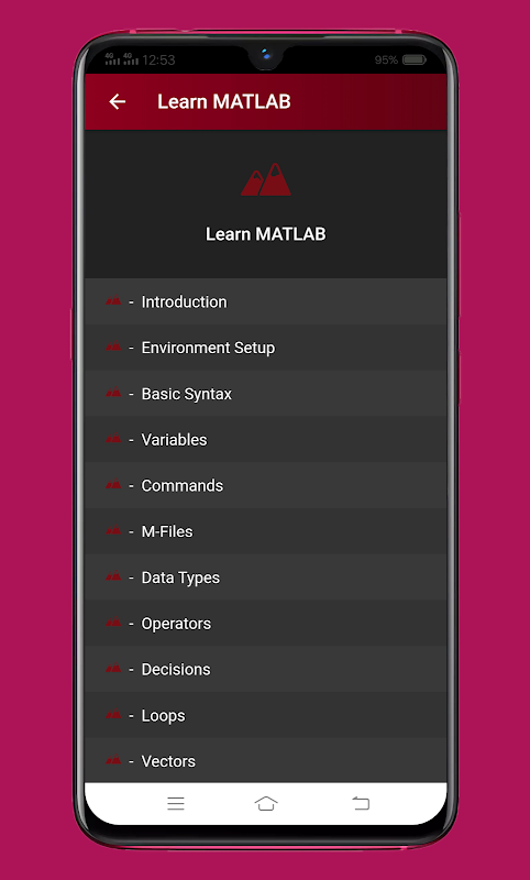Learn Matlab Programming for Free & Offline, Matlab Tutorial, Matlab Programs. MATLAB (matrix laboratory) is a multi-paradigm numerical computing environment and proprietary programming language developed by MathWorks. Adopting the philosophy that everything is a matrix, MATLAB allows matrix manipulations, plotting of functions and data, implementation of algorithms, creation of user interfaces, and interfacing with programs written in other languages, including C, C++, C#, Java, Fortran and Python. This App has been prepared for the beginners to help them understand basic to advanced functionality of MATLAB programming. After completing this App you will find yourself at a moderate level of expertise in using MATLAB programming from where you can take yourself to next levels