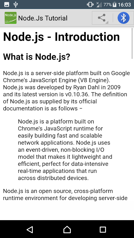 Node.js is a very powerful JavaScript-based framework/platform built on Google Chrome's JavaScript V8 Engine. It is used to develop I/O intensive web applications like video streaming sites, single-page applications, and other web applications. Node.js is open source, completely free, and used by thousands of developers around the world.