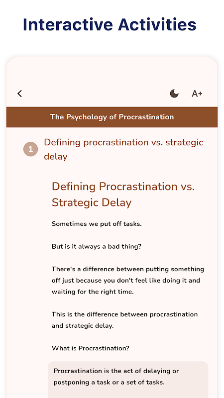 • Gestructureerde content: Leer stap voor stap, van het begrijpen van uitstelgedrag tot het beheersen van zelfdiscipline.