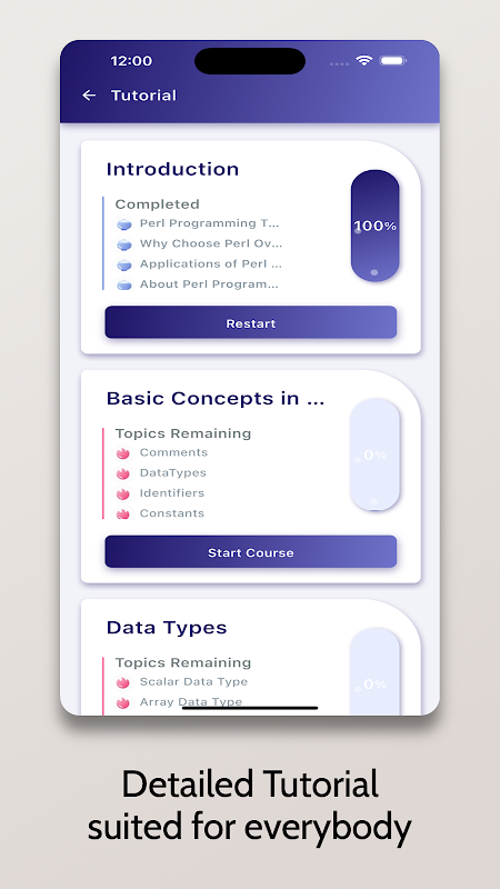 Of je nu Perl-programmeren leert als hobby, voor school/universiteit of om een carrière op te bouwen, deze tutorial helpt je op weg! Hij neemt je mee van de basis tot geavanceerde concepten zoals datastructuren – allemaal met een strakke, interactieve interface.