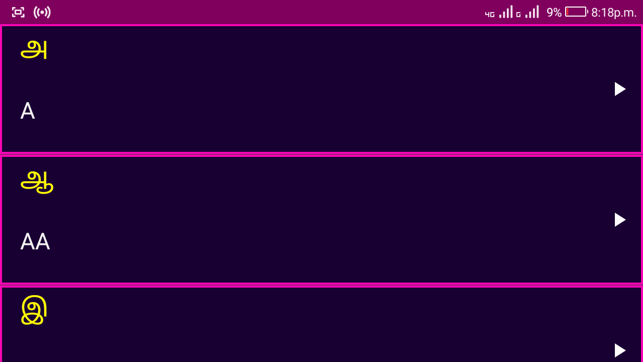 Leer de app Tamil-alfabetten en cijfers Wordt geleverd met een mooi en gebruiksvriendelijk app-ontwerp. Voor elk Tamil-alfabet en Tamil-nummer worden duidelijke spraakopnamen gemaakt door een native Tamil-sprekende persoon. Deze app werkt ook offline.