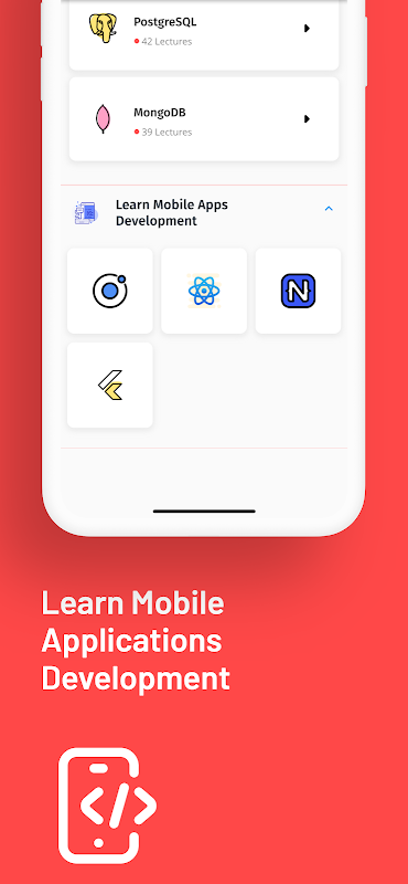 Als je geïnteresseerd bent in de ontwikkeling van mobiele apps, omvat onze app ook frameworks zoals React Native, Ionic en NativeScript. Met onze app kun je alles leren wat je moet weten om een bekwame programmeur en ontwikkelaar te worden.