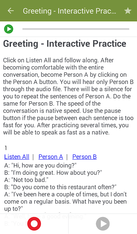 Spreek Standaard Engels is de officiële Gratis TalkEnglish.com Android App. Er zijn meer dan 900 lessen en 8.000 audiobestanden om u te helpen om te leren hoe u vloeiend Engels kunt spreken. De meeste lessen bevatten klikbare zinnen waarop u kunt klikken om te horen hoe een spreker met Engels als moedertaal die zin zegt. Elke les heeft ook de mogelijkheid om uzelf op te nemen. U kunt uw eigen stem opnemen terwijl u die zin zegt om het vervolgens met het audiobestand van de spreker met Engels als moedertaal te vergelijken.