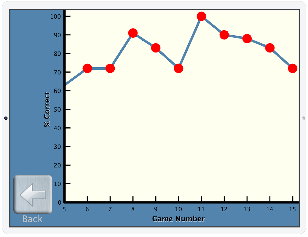 • Track gegevens en statistieken - Aan het einde van het spel, een grafiek van de gegevens van het kind zal worden gepresenteerd. Tik op de grafiek om te vergroten, en raak elk gegevenspunt om informatie over de prestaties van het kind te verzamelen.