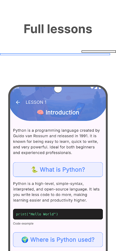 Begin je programmeeravontuur met Python, een van de populairste en krachtigste talen ter wereld! Python leren is de ideale app voor beginners die op een visuele, efficiënte en gemakkelijke manier willen leren – direct vanaf hun telefoon, zonder dat ze een computer nodig hebben.
