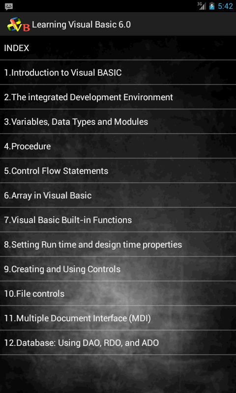 Learning Visual Basic is a step by step guide/tutorial on Visual Basic, it is aimed at those who are starting or have just started learning Visual Basic. Learn Visual Basic in the quickest time possible with this concise app that teaches you all the essentials about Visual Basic. This app is for people who have NO background in programming or are beginners. Soon, you can utilize your Visual Basic skills in .NET web programming, forms programming.