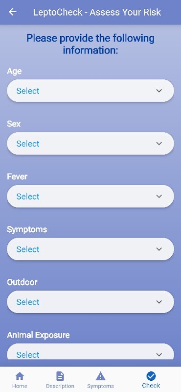 Uitgebreide Symptomen Checker: Gebruikers kunnen hun symptomen invoeren, en Lepto Check beoordeelt de waarschijnlijkheid van leptospirose en geeft aanbevelingen voor verdere actie of medisch advies.