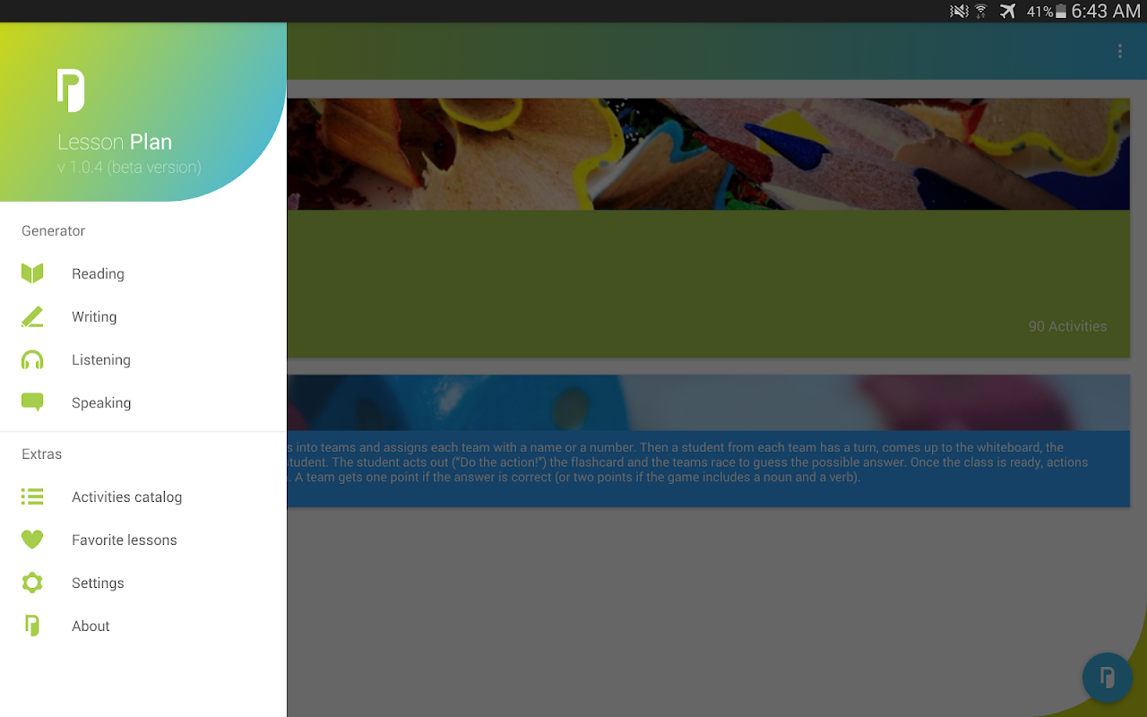 Lesson Plan is een applicatie die 50 minuten les Engels genereert plan templates (met een set moderne methode structuur). Alle lessen onderdelen zijn gemaakt om bijna alle (cross-grade) student levels te passen. Elke les deel bestaat uit 9 willekeurig gegenereerde leuke VSV-activiteiten.