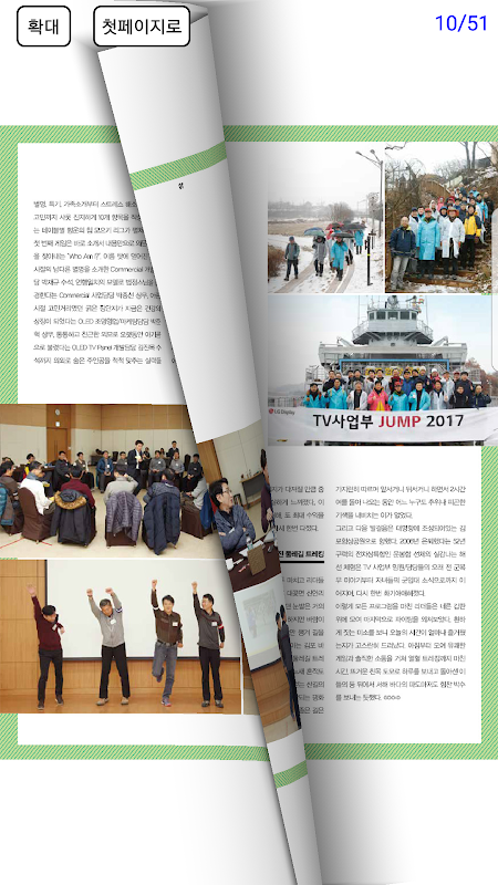 사내보 은 오프라인에서는 책으로, 홈페이지에서는 e북으로 보여지고 있으며, 더 많은 독자들을 만나기 위해 새로운 모바일 서비스인 앱진을 2017년 4월부터 오픈했습니다. 많은 이들의 관심 속에서 성장 중인 은 늘 새롭게 변신하며, 기대 그 이상의 재미와 가치를 전하기 위해 노력할 것입니다. 앞서가는 LG디스플레이와 함께 사보 의 성장도 관심 있게 지켜봐 주세요.