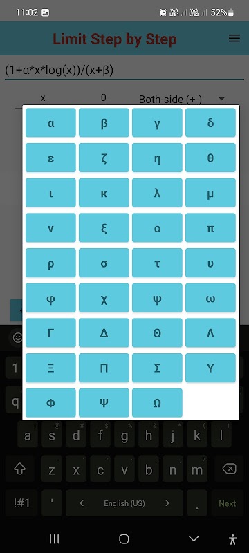 Deze offline app berekent de limiet (eenzijdig of beidezijdig) van een wiskundige uitdrukking en toont rekenstappen. Met deze gedetailleerde stapsgewijze berekeningen leert u hoe u de limiet kunt berekenen. Deze app heeft de mogelijkheid om automatisch de beste aanpak te selecteren voor het berekenen van de limiet.