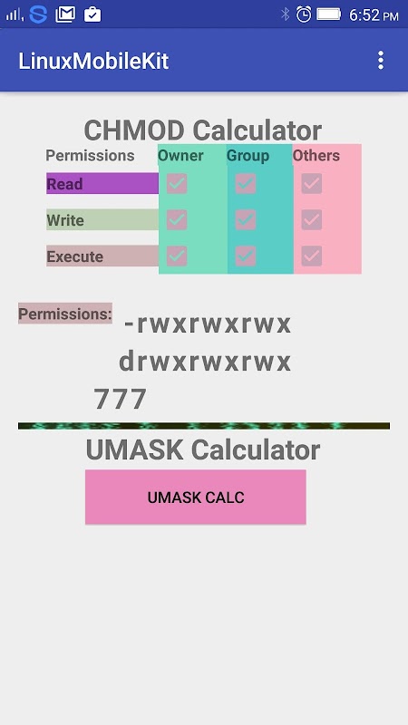 App with CHMOD and UMASK Calculator and basic commands that come in handy for troubleshooting purposes.