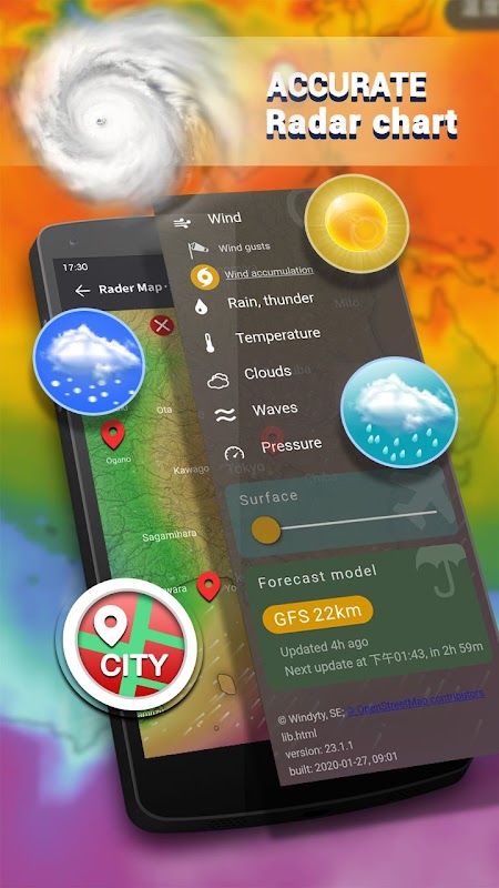 Realtime temperature, humidity, pressure, wind force and wind direction are all in this weather app based.