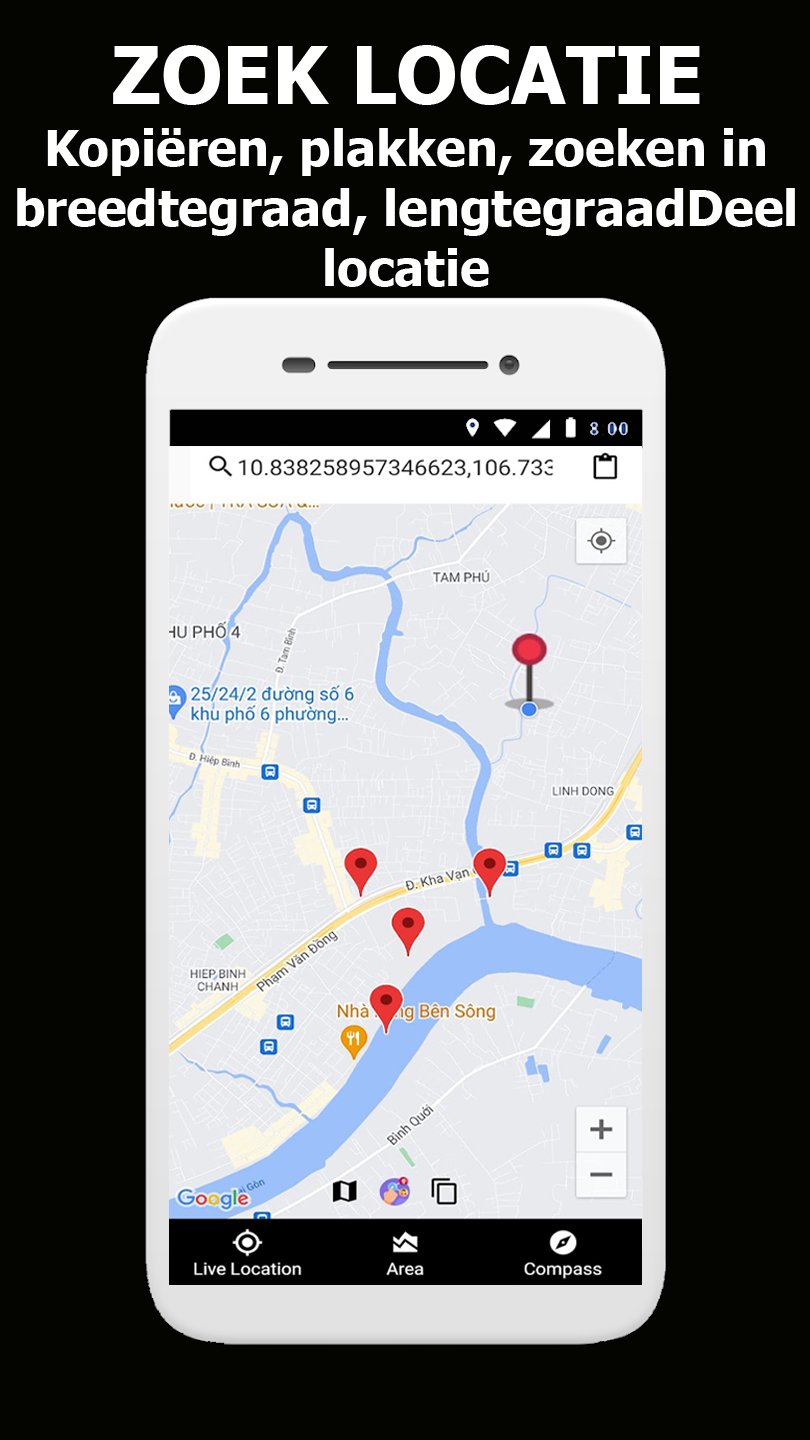 * Locatie delen tracker: In realtime kunt u op kaarten bewegen; de applicatie draait automatisch met u mee. Krijg coördinaten overal ter wereld, wanneer u uw locatie (coördinaat: breedtegraad en lengtegraad) succesvol deelt met uw vrienden of familieleden, kan uw vriend heel gemakkelijk naar die locatie verhuizen. Om dit te doen, moet u uw locatie kopiëren en deze verzenden naar sms, netwerk of een app.
