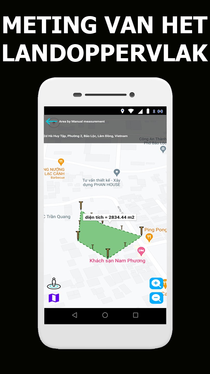 Landoppervlaktemeting door te lopen: u kunt overal ter wereld in realtime bewegen, Live locatie delen berekent automatisch de oppervlaktemeting en toont het resultaat op het scherm.