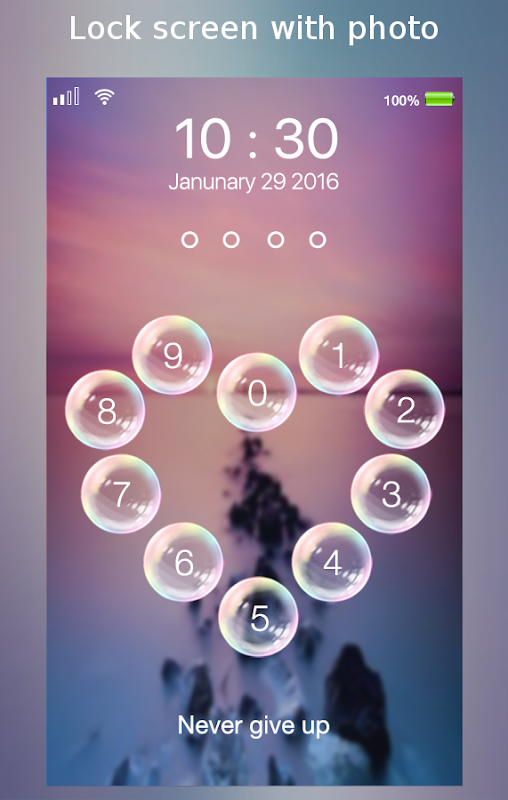 this application is one of our best lock screen. You will have a lock screen with many soap bubbles which was arranged into a heart. You can change color and size of time, date. You can change background of lock screen. You will have your own attractive lock screen.