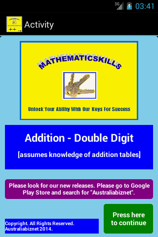 The practise sessions in Long Addition are randomly generated however they are generated within strict parameters to ensure the sessions remain within the users capabilities. The "practise" sessions will continue to provide an unlimited number of exercises until the user chooses to return to the menu.