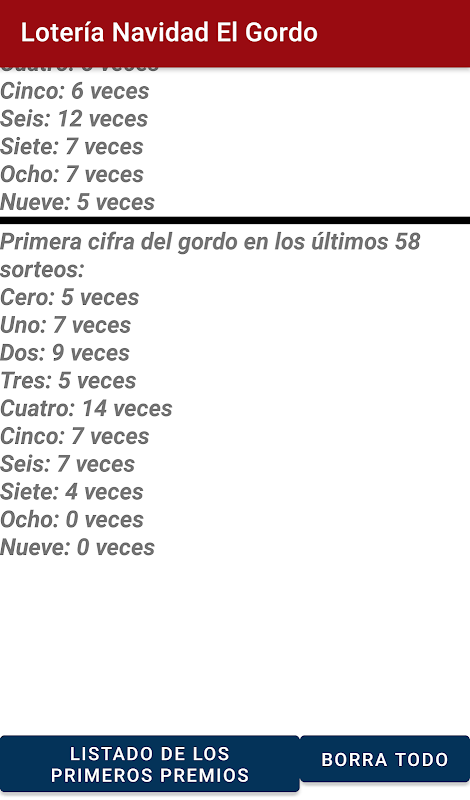 Por último, el usuario puede consultar todos los números que han sido premiados con el Gordo a lo largo de la historia. La aplicación te muestra tanto el número premiado como el año en que ese número fue agraciado.