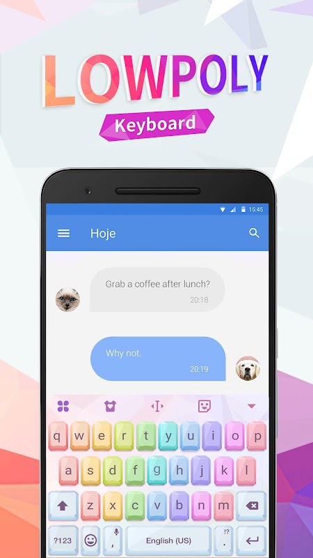 With a help of ♥Low Poly Emoji Keyboard Theme ♥ you can dress up your device with numerous elegant themes.Our theme is designed to change the appearance of your keyboard in a fashionable and beautiful way. It can be used to type on SMS, Facebook, Twitter, Instagram, Messenger, Gmail, WhatsApp and any other social apps directly from this emoji app.