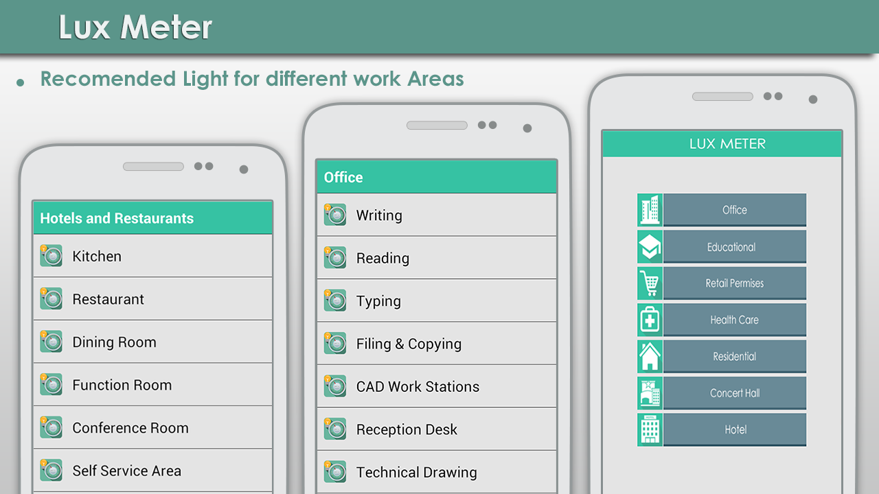 - Guidance for recommended light level in different work spaces like rooms, hotels, offices, museums and other residential areas.