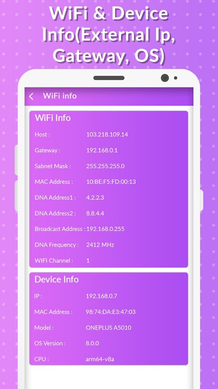 - WiFi Info shows Host, Gateway, Subnet Mask, DNS Address, Broadcast Address, Frequency and WiFi Channel.