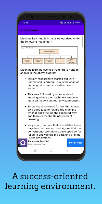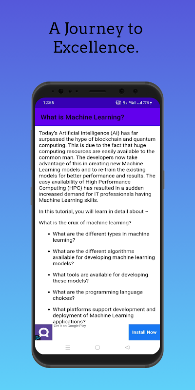 This app has been prepared for professionals aspiring to learn the complete picture of machine learning and artificial intelligence. This app caters the learning needs of both the novice learners and experts, to help them understand the concepts and implementation of artificial intelligence.
