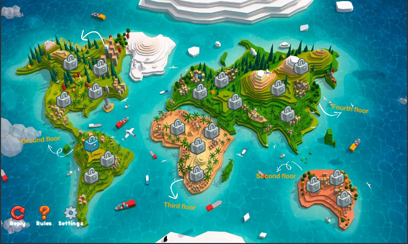 Het bevat 20 niveaus die in de volgende volgorde moeten worden gespeeld: