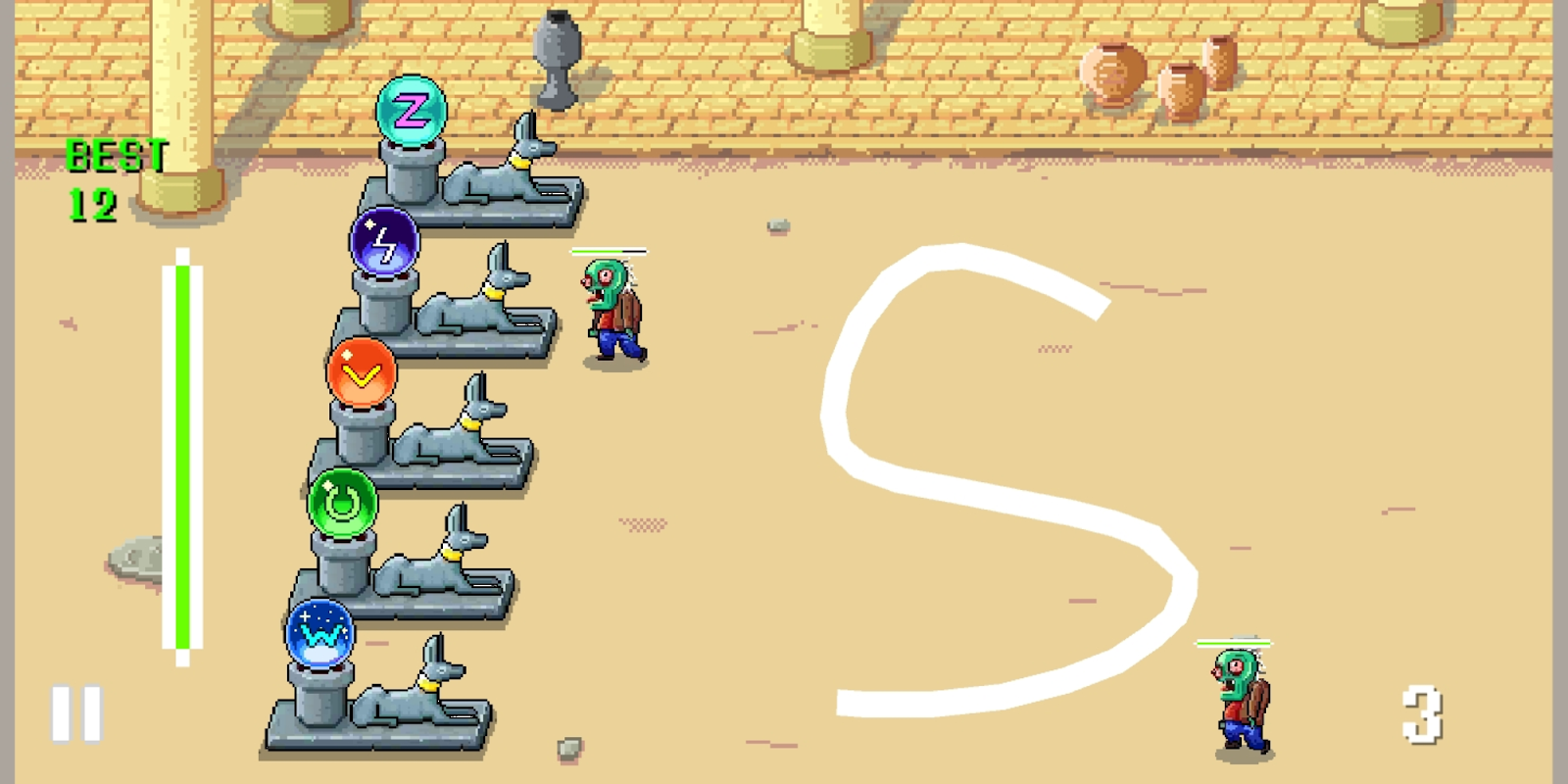 Het spel is eenvoudig, teken op het scherm de vorm die overeenkomt met de edelsteen die op de beelden verschijnt om een spreuk uit te spreken om de zombies te doden.