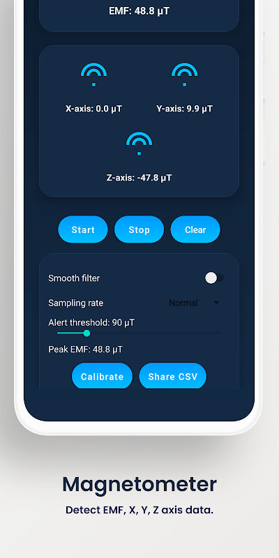 • Nauwkeurige EMF- en magnetische veldmeter: Monitor de magnetische veldsterkte in realtime met behulp van 3-assige (X/Y/Z) magnetometergegevens. Bekijk nauwkeurige metingen in microtesla (µT) om magnetische interferentie of sterkte te detecteren.