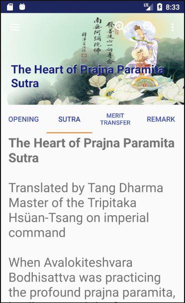 Een apps. die het mogelijk maken gebruiker Mahayanaboeddhistische Soetra's en mantra's te bladeren in het Engels, Vereenvoudigd Chinees en Traditioneel Chinees. Lettertype grootte kan zijn aanpast groter of kleiner op de actie menu. Pinyin in Vereenvoudigd Chinees of Zhuyin in de traditionele Chinese ook aanwezig. Deze app verschijnt ook informatie over het openen, teksten, Merit Overdracht, en Opmerking van de geselecteerde sutra of mantra.