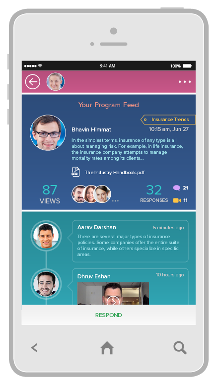 Users can consume bite-sized content pushed to them as well as participate in live audio / video mentoring and coaching sessions.
