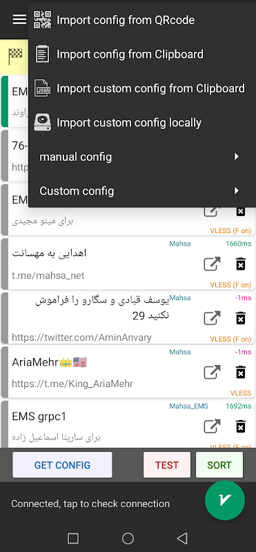 MahsaNG werkt in combinatie met VPN-configuraties van derden die genereus aan ons zijn bijgedragen via "Mahsa Server." Deze configuraties worden vervolgens op intelligente wijze onder onze gebruikers verdeeld.
