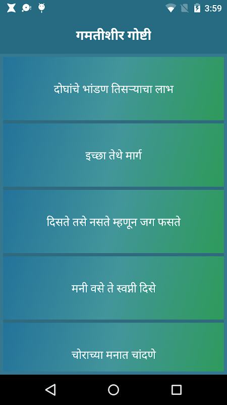 या अँप मधून म्हणी सोबत त्याचा अर्थ व त्या म्हणी वरील आधारित गोष्टींचा समावेश या अँप मध्ये करण्यात आला आहे.