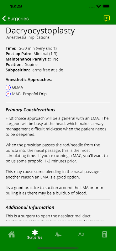 Deze applicatie komt tegemoet aan de behoefte van anesthesieprofessionals om snel antwoorden op veelgestelde vragen te vinden. Het primaire doel is om de arts te voorzien van de benadrukte implicaties van specifieke ziekten en chirurgische gevallen. Daarnaast is er ook een doorzoekbare lijst van meer dan 900 acroniemen. Ten slotte is er een rekenmachine gemaakt om te helpen met medicatiedoseringen, apparatuur, vitale functies en meer.