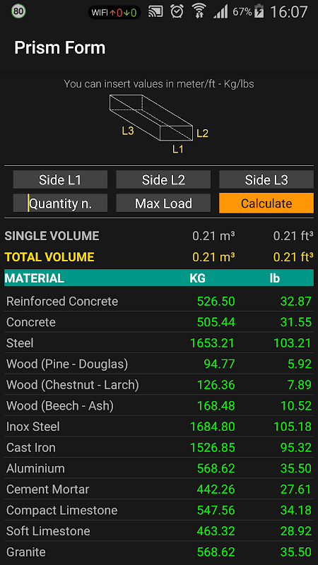 the app will give you the volume of the single beam, the total volume, and the total load. If you put the volume quantity = 1, and the load is a single beam or floor etc.