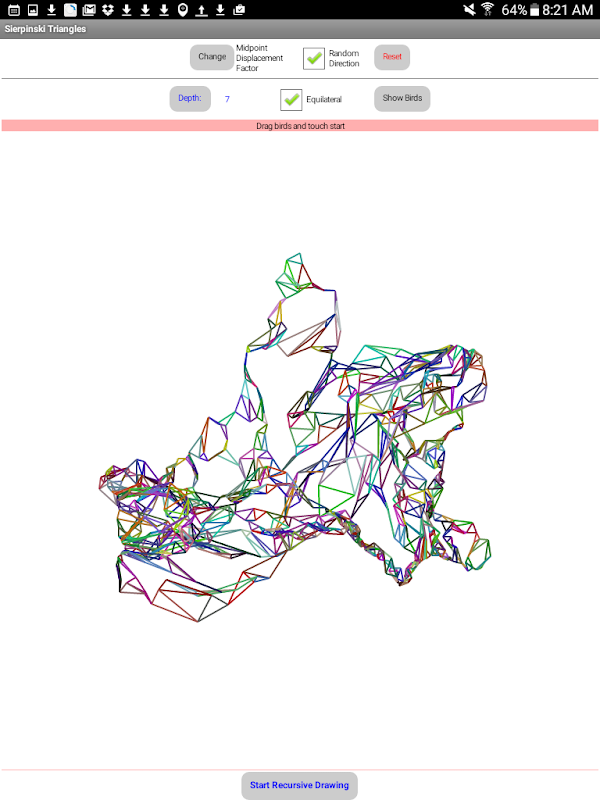 Sierpinski Triangles are fractals, which means part of the triangle is similar to the whole triangle. Typically, we would start with an equilateral triangle and find the midpoints of each side and then draw smaller triangles using the midpoints and its existing vertices. The process goes on forever. There are a few geometric sequences that are worth exploring with K-12 students. This app has several features. First, it allows users to start with any triangle and create self-similar triangles using recursion. Second, it allows the midpoints to be displaced linearly in a random way. Third, it allows the midpoints to be randomly displaced in all directions. There are numerous shapes; so enjoy the beauty of triangular fractals. Warning: Please be patient if you choose to go deep into the structure. It just takes time due to the very nature of recursion. All rights reserved by developer.
