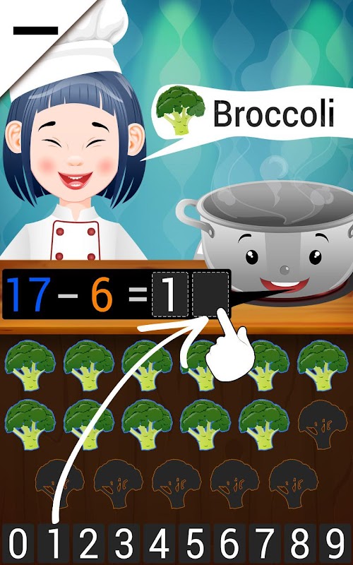 Bovendien: het oplossen van een vergelijking van de ingrediënten om de chef-kok te geven - de vergelijking bestaat uit 2 nummers worden toegevoegd en ze zijn in verschillende kleuren en de ingrediënten die de nummers hebben een gloed van dezelfde kleur - u kunt ook aanraken en ze tellen de toevoeging doen.