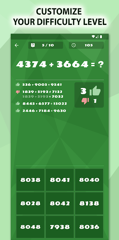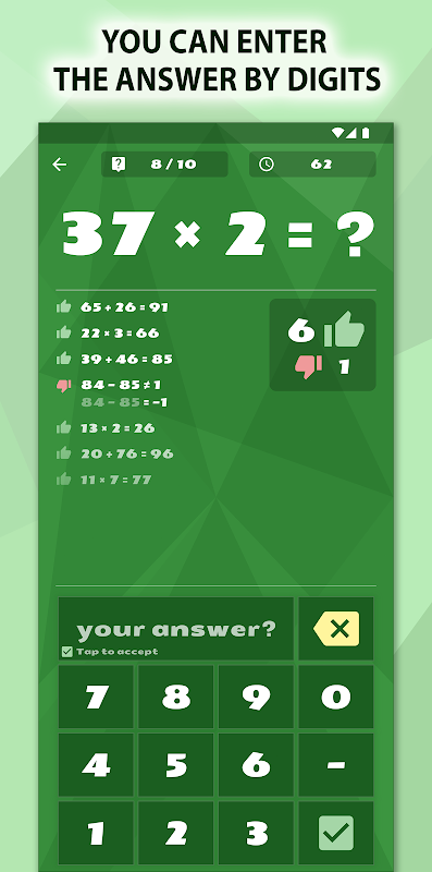 ★ Leerlingen en studenten. Voor de dagelijkse wiskundeoefening. Er kunnen tijdslimieten worden aangezet, dit oefent druk uit en maakt het spel scherper. Het aantal antwoordmogelijkheden moet worden ingesteld op 6, 9 of worden ingevoerd in cijfers.