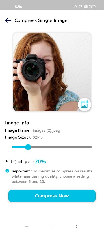 Maak foto's rechtstreeks vanuit de app en comprimeer ze in realtime. Bewaar gecomprimeerde afbeeldingen in uw galerij voor toekomstig gebruik, perfect voor gebruikers onderweg!