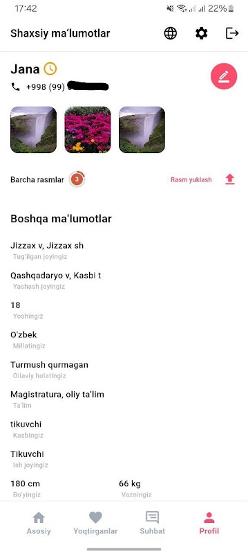 • Profiel yaratish – yosh, jins, qiziqishlar va boshqa ma'lumotlarni to'ldirib, profileringizni tayyorlaysiz, rasmingizni yuborasiz.