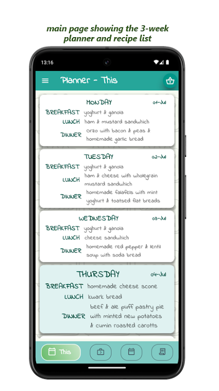 Het doel van de app is om een manier te bieden om je maaltijden voor de huidige week en de volgende twee weken te plannen. Met de app kun je ook een overzicht bijhouden van de items die je in de kast, koelkast en vriezer hebt, evenals een boodschappenlijstje. . U kunt ook een lijst met uw favoriete recepten bijhouden.