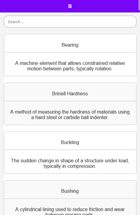 Uitgebreide terminologie: onze app bevat een uitgebreide verzameling werktuigbouwkundige termen, die alles omvatten, van basisconcepten tot geavanceerde terminologie. Elke inzending biedt definities om een grondig begrip van de werktuigbouwkundige principes te garanderen.