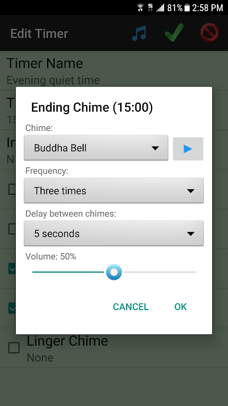 Chimes for a timer can be applied at any time during the session, or a linger chime after the session is complete.