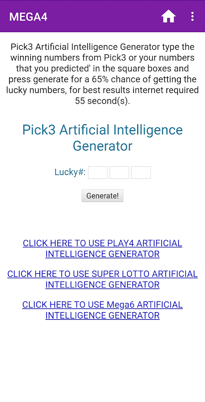 Mega4 is a Artificial intelligence app that pick numbers chose numbers for you base on the winning numbers that you input in the square boxes or you can just press generate.
