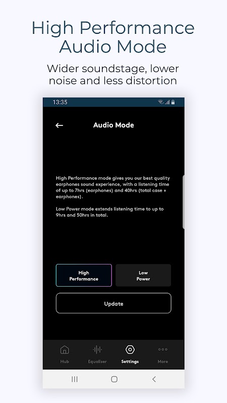 Schakel tussen onze baanbrekende High Performance Audio-modus en de energiebesparende modus.