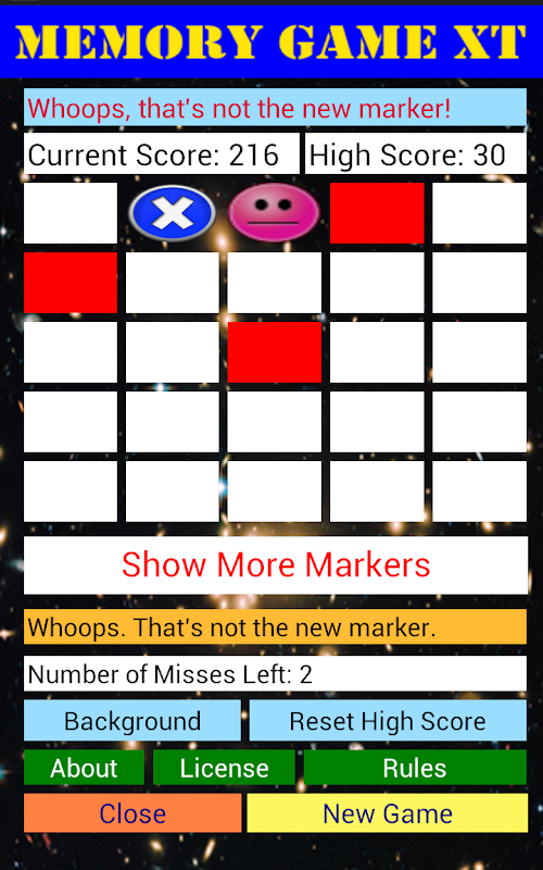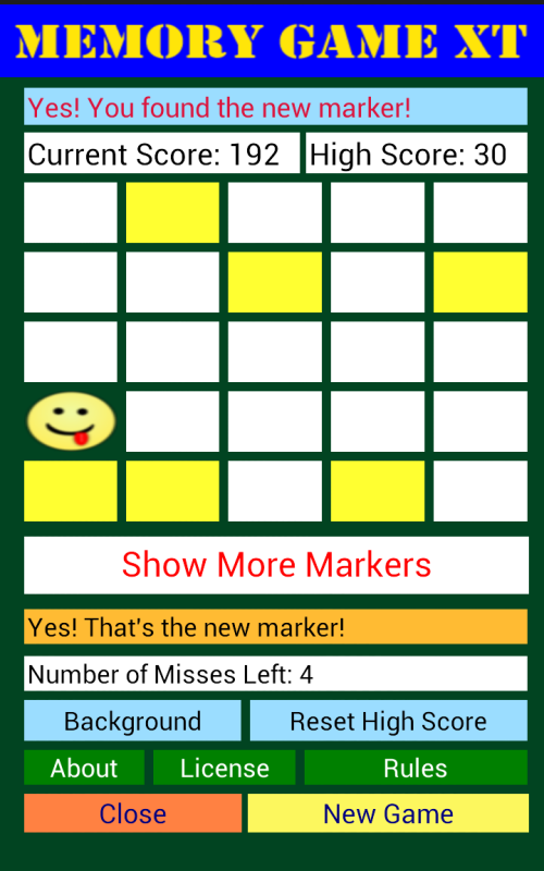 After 3 seconds, the board is automatically cleared. The markers reappear with 1 new marker placed in a random position on the matrix. Your mission is to find and tap the new marker added to the matrix.