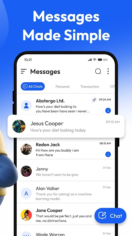 Berichten – Tekst SMS Organizer is de ultieme sms-app die je inbox overzichtelijk, overzichtelijk en veilig houdt. Met slimme tools zoals categorieën, planning, spamblokkering, archivering en snel beantwoorden mis je nooit meer een belangrijk bericht.