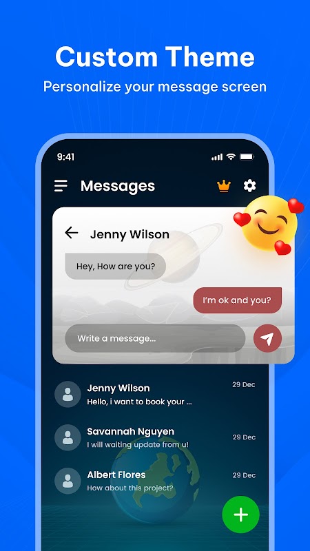 Verzend en ontvang sms-berichten offline, plan berichten. Personaliseer met kleurrijke thema's, gebruik emoji's om jezelf te uiten en chat in de taal van jouw voorkeur.