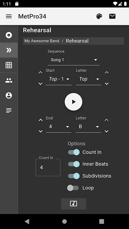 Repeteren met MetPro34 is ook gemakkelijker dan ooit. Het enige dat u hoeft te doen, is de reeks selecteren die u wilt oefenen, de start- en stoppunten instellen op maatnummer of repetitiemarkering en op start drukken! Je kunt ook een count-in toevoegen, het spelen van onderverdelingen / niet-accenten wisselen en het hele stuk (inclusief count-in!) Herhalen om herhalingen op herhalingen te krijgen.