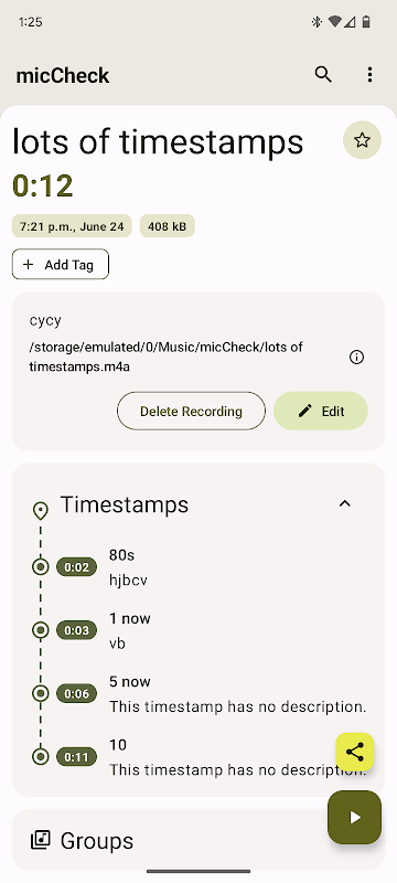 • Uitgesplitste opnamen 📦 - Terwijl de meeste andere audiorecorders gewoon een titel voor uw opname bevatten, deelt micCheck alle informatie met betrekking tot uw opname - zoals bijlagen, tijdstempels, clips en meer - in zijn eigen beknopte scherm voor elke opname!